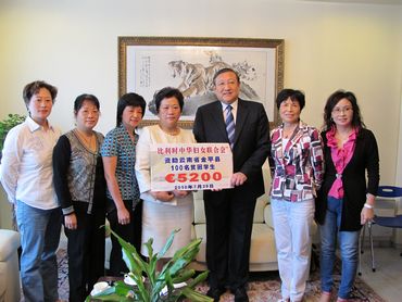 2010年7月29日,中國駐比利時使館舉行捐贈儀式,駐比大使張援遠(yuǎn)代表外交部,接受比利時中華婦女聯(lián)合會(簡稱“婦女會”)向云南省金平縣貧困學(xué)生的捐款,并親切會見了女僑胞代表。