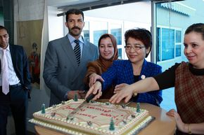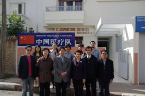 許大使向穆罕默地亞援摩醫療隊負責人了解情況 許大使與穆罕默地亞援摩醫療隊隊員合影 |