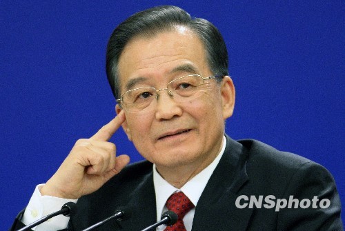 3月14日上午,十一屆全國人大三次會議在北京人民大會堂落下帷幕后,國務院總理溫家寶在人民大會堂金色大廳舉行記者招待會回答記者提問。 中新社發 任晨鳴 攝