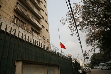 2010年8月15日晨,駐剛果(金)使館舉行降半旗志哀活動,沉痛悼念甘肅舟曲特大山洪泥石流遇難同胞,愿死者安息生者堅強,使館全體館員出席活動。