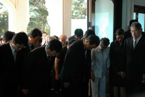 管大使及使館館員向蟻光炎先生遺像致敬 同參加紀念活動的僑領合影
