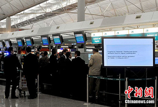 3月11日,日本東北部發生歷來最強烈的八點九級大地震。在香港機場國泰航空柜位,不少前往日本的旅客在著急查問相關情況,而LCD電屏不斷以英文顯示日本成田、羽田兩大機場情況。中新社發 鄧慶樂 攝