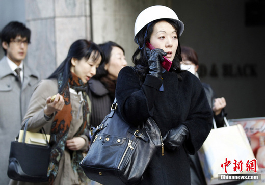 日本近海3月11日發(fā)生了強(qiáng)烈地震,首都東京震感強(qiáng)烈。日本氣象廳隨即發(fā)布了海嘯警報(bào),稱地震將引發(fā)約6米高海嘯。圖為東京市金融區(qū)一女子從建筑物內(nèi)疏散后頭戴安全帽在打電話。
