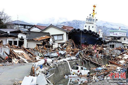 3月16日上午,日本巖手縣大船渡市“3.11日本東北大地震”災區,一艘漁船被海嘯卷到市內街道上。中新社發 侯宇 攝