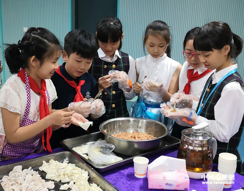 在福州中山小學,兩岸小朋友一起包肉燕。(中國臺灣網發)