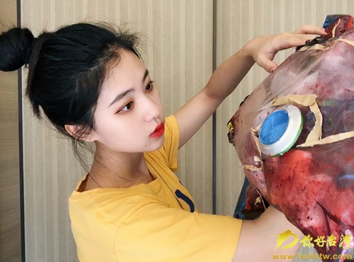 香港女生陳濼屹的作品《侵蝕》,制作的是一條被人類生活垃圾填充的“魚”,顏料處理的紅色“鮮血”觸目驚心,看到作品的同時立刻意識到海洋污染的嚴重性 。