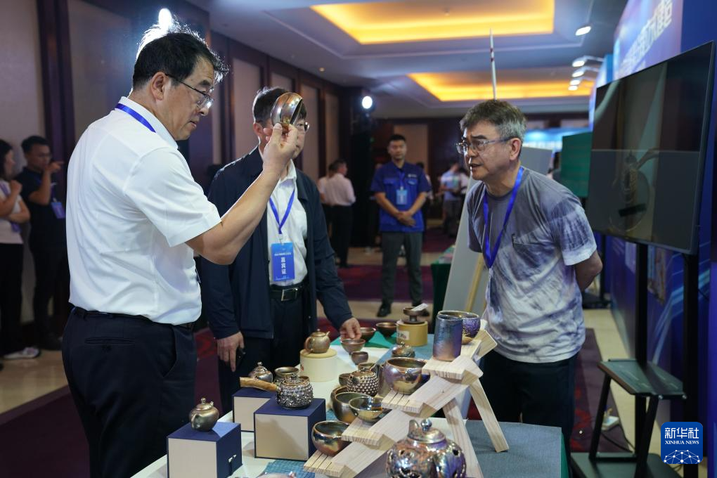 6月15日,在2025海峽職工論壇傳統(tǒng)工藝非遺產(chǎn)品展示區(qū)的柴燒窯(臺(tái)灣)展位,參會(huì)人員與柴燒陶藝傳承人吳重毅老師(右一)交流。新華社發(fā)(王鑫攝)
