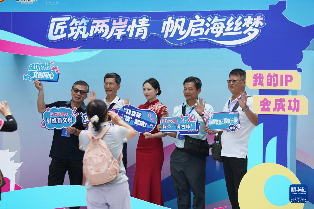6月15日,參會(huì)人員在“匠筑兩岸情 帆啟海絲夢(mèng)”的展板前合影。新華社發(fā)(王鑫攝)