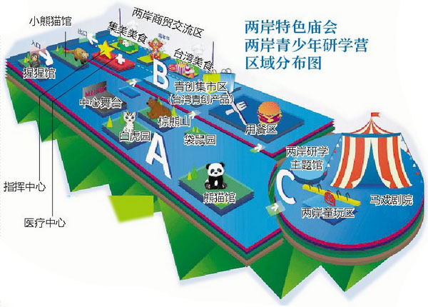 本屆廟會在去年的經驗基礎上,將更加突出對臺研學主題。兩岸研學體驗區將以福建省對臺文化交流基地和馬戲城內的兩岸研學主題館為核心,圍繞中華傳統文化的六藝(禮、樂、射、御、書、數)為核心內容開展特色研學課程,結合閩南童玩、科技探索、熊貓科普、社區營造、風土人文等,搭建兩岸青少年交流互動的有效平臺,增進臺灣青少年對中華文化的認同。