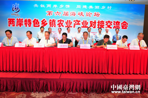 53對(duì)閩臺(tái)特色鄉(xiāng)鎮(zhèn)的農(nóng)業(yè)產(chǎn)業(yè)代表在主會(huì)場(chǎng)簽訂對(duì)接合作交流協(xié)議。(中國臺(tái)灣網(wǎng) 發(fā))