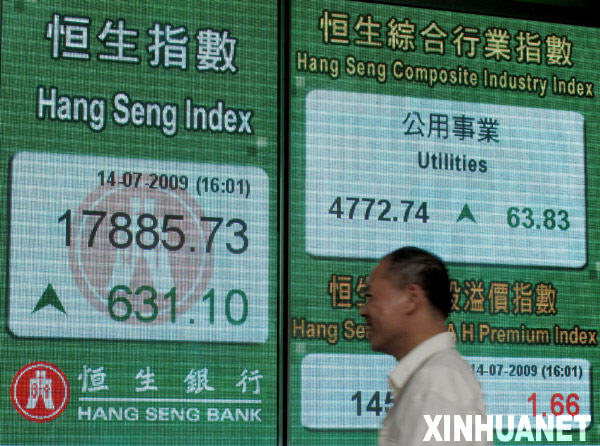 7月14日,一位市民從香港中環(huán)一家銀行的恒生指數(shù)電子顯示屏前走過。當(dāng)日,香港恒生指數(shù)收報17885.73點,上漲631.10點。新華社記者呂小煒攝
