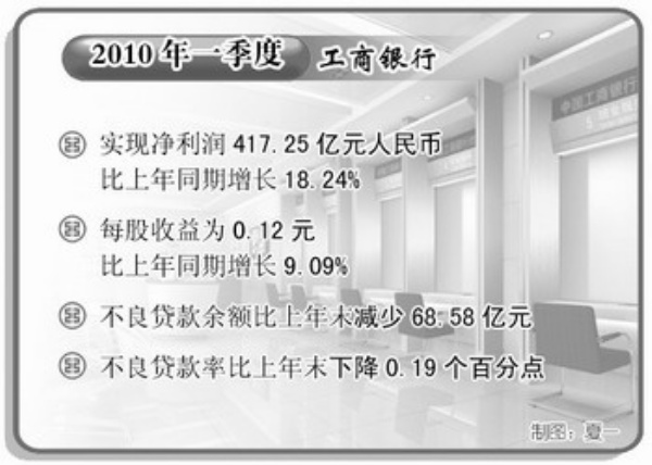 工商銀行2010年第一季度實(shí)現(xiàn)凈利潤417.25億元人民幣,比上年同期增長18.24%,每股收益為0.12元,比上年同期增長9.09%。