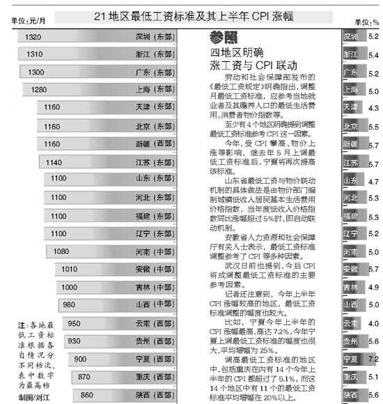 21個地區最低工資標準及其上半年CPI漲幅