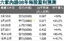 據分析師預測,內銀股中,以中信銀行去年的盈利增長最出眾,平均達60.4%;中國銀行最遜色,平均只有23.2%。市場的焦點料會放在減息影響凈利息收益率、放貸增加引致的資產質素轉差,以及投資虧損等。