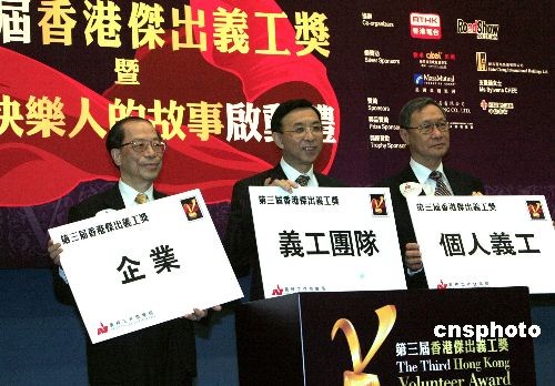 四月二十八日,第三屆香港杰出義工獎(jiǎng)暨“15個(gè)快樂(lè)人的故事”發(fā)布會(huì)在香港舉行。第三屆香港杰出義工獎(jiǎng)評(píng)審委員會(huì)主席鄭海泉、義務(wù)工作發(fā)展局主席李澤培及香港杰出義工獎(jiǎng)籌委會(huì)主席沈之弘等出席啟動(dòng)禮。 中新社發(fā) 張勤 攝