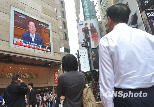 十月十四日,香港特區行政長官曾蔭權在立法會公布二零零九至一零年施政報告,市民在銅鑼灣時代廣場戶外大型電視屏幕下駐足收看電視直播。 中新社發 鄧慶樂 攝