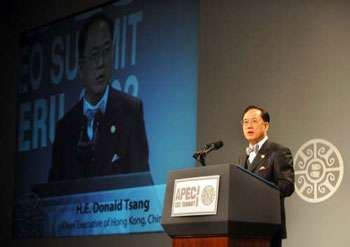 將于下月出席亞太經(jīng)合會議的曾蔭權(quán)表示,會就規(guī)管評級公司、對沖基金等提出意見。圖為曾蔭權(quán)去年在同一會議上發(fā)表演說。(圖片來源:大公報(bào))