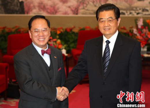12月22日下午,國家主席胡錦濤在北京中南海會見前來述職的香港特區行政長官曾蔭權。 中新社記者 任晨鳴 攝