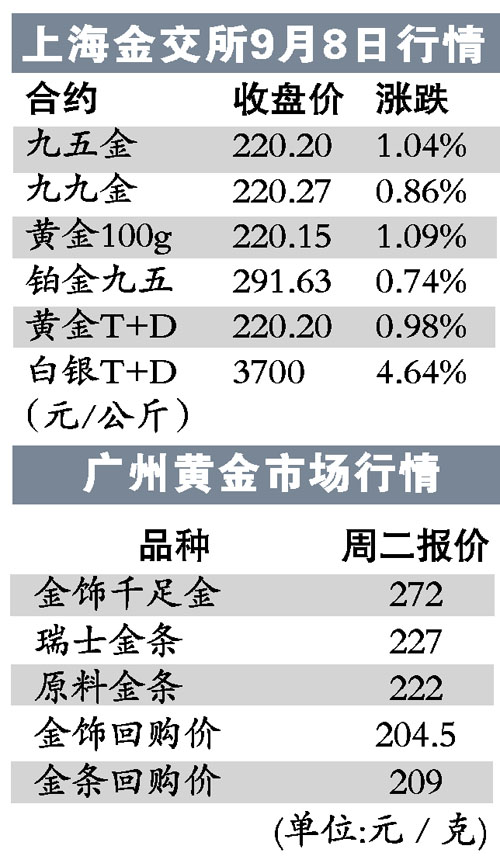 在國際金價推動下,周二國內金價全線上漲,其中上海金交所現貨九九金最高升至220.65元/克,創下2008年3月18日以來的17個月新高。