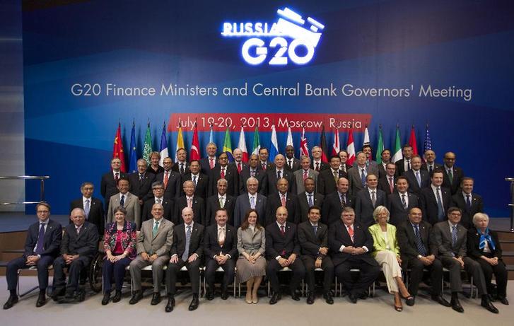 新華社照片,莫斯科,2013年7月20日 G20財長和央行行長會議敦促各國審慎調整貨幣政策 7月20日,出席二十國集團財政部長和央行行長會議的代表在俄羅斯首都莫斯科馬涅什展覽中心會場內合影。 當日,二十國集團財長和央行行長會議在莫斯科閉幕,會后發表的聯合公報敦促各國審慎調整貨幣政策,加強與其他國家的溝通與協調。 新華社/美聯