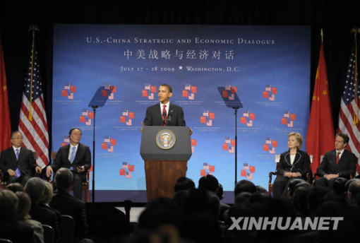 7月27日,首輪中美戰(zhàn)略與經(jīng)濟(jì)對(duì)話(huà)在美國(guó)華盛頓開(kāi)幕。中國(guó)國(guó)家主席胡錦濤特別代表、國(guó)務(wù)院副總理王岐山,國(guó)務(wù)委員戴秉國(guó)出席開(kāi)幕式。這是美國(guó)總統(tǒng)奧巴馬在致辭。新華社記者張巖攝