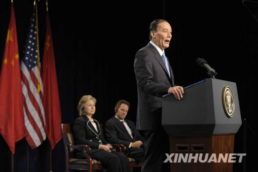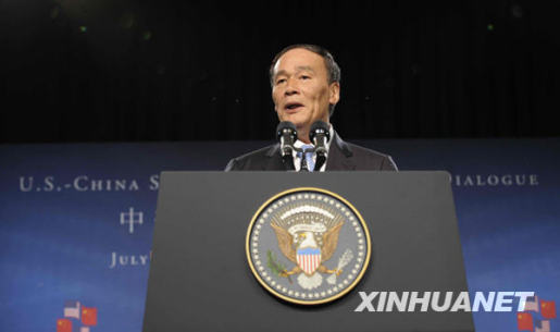 7月27日,中國(guó)國(guó)家主席胡錦濤特別代表、國(guó)務(wù)院副總理王岐山在首輪中美戰(zhàn)略與經(jīng)濟(jì)對(duì)話(huà)開(kāi)幕式上講話(huà)。當(dāng)日,首輪中美戰(zhàn)略與經(jīng)濟(jì)對(duì)話(huà)在美國(guó)華盛頓開(kāi)幕。新華社記者張巖攝