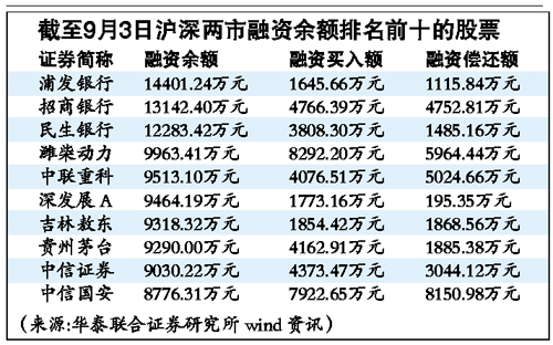 數據顯示,截至2010年9月3日,滬深兩市融資余額排名前三名的股票分別是浦發銀行、招商銀行、民生銀行,其次依次是濰柴動力、中聯重科、深發展A、吉林敖東、貴州茅臺、中信證券、中信國安。從這些股票所分布的行業來看,金融服務、交運設備、機械設備、采掘、食品飲料和化工是主流。