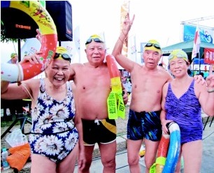 梁玉華(左起)、李金滿和向延發(fā)、陳瑞華這兩對(duì)廣州冬泳會(huì)最年長(zhǎng)的泳渡日月潭夫妻檔,合計(jì)正好三百歲。圖片來(lái)源:聯(lián)合報(bào)