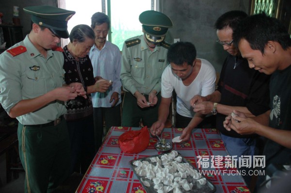 福清南青嶼赤表村84歲高齡的林金鈿老人和福清南青嶼邊防官兵、臺胞等一起包餃子。