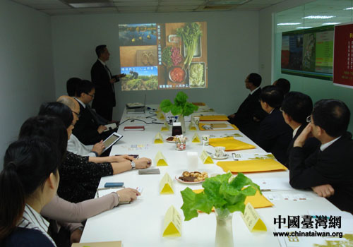 臺灣鏡群國際規(guī)劃設(shè)計顧問有限公司工作人員向撫順市委副書記喻國偉一行介紹公司現(xiàn)在農(nóng)業(yè)項目開展情況時的情景。(圖片來源:撫順市臺辦)