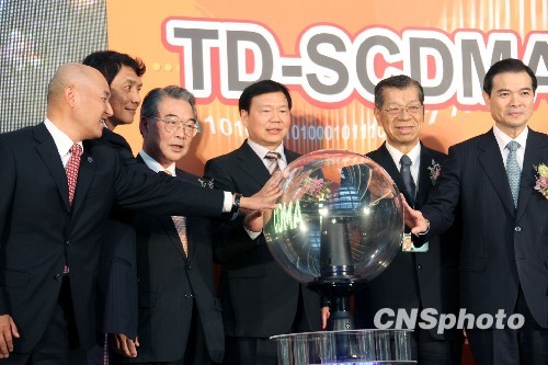 11月24日,中國(guó)電子工業(yè)標(biāo)準(zhǔn)化技術(shù)協(xié)會(huì)和中國(guó)通信標(biāo)準(zhǔn)化協(xié)會(huì)名譽(yù)理事長(zhǎng)婁勤儉(右3),和臺(tái)灣金仁寶集團(tuán)董事長(zhǎng)許勝雄(左3)等在臺(tái)北共同按下啟動(dòng)球,宣告臺(tái)灣威寶電信“TD-SCDMA試驗(yàn)網(wǎng)”正式開(kāi)通。臺(tái)灣TD試驗(yàn)網(wǎng)的開(kāi)通,是落實(shí)海峽兩岸信息產(chǎn)業(yè)技術(shù)標(biāo)準(zhǔn)論壇達(dá)成的共識(shí),展示兩岸在第三代移動(dòng)通信系統(tǒng)TD-SCDMA技術(shù)、研發(fā)和產(chǎn)業(yè)化方面所取得的合作成果。 中新社發(fā) 黃少華 攝