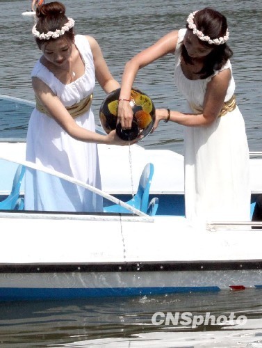 25日下午,由臺灣南投縣縣長李朝卿帶來的一壇日月潭水緩緩注入位于吉林省長春市的凈月潭內,兩個姊妹潭的潭水瞬間融在一起。同時,一艘命名為“日月潭號”的游船在長春凈月潭投入使用。