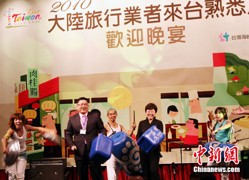 12月3日,大陸新增6省區赴臺游的旅游業者組團訪臺踩點,臺灣海峽兩岸觀光旅游協會及臺灣旅行業界為此在臺北舉行晚宴歡迎。自2010年7月18日起,內蒙古、西藏、甘肅、青海、寧夏、新疆6省區新增為大陸居民赴臺旅游的開放區域。圖為踩點團團長、大陸海峽兩岸旅游交流協會副秘書長李亞瑩與臺灣海峽兩岸觀光旅游協會副會長劉喜臨在晚宴上共同擊鼓助興。中新網發 黃少華 攝