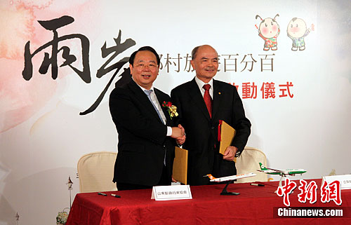 3月26日電,由山東省旅游行業協會和臺灣休閑農業發展協會聯合主辦的“兩岸鄉村旅游百分百活動”今天在此間啟動。圖為山東省旅游行業協會會長于衝(左一)和臺灣立榮航空公司董事長蘇宏義共同簽署互送客源協議。 陳立宇 攝