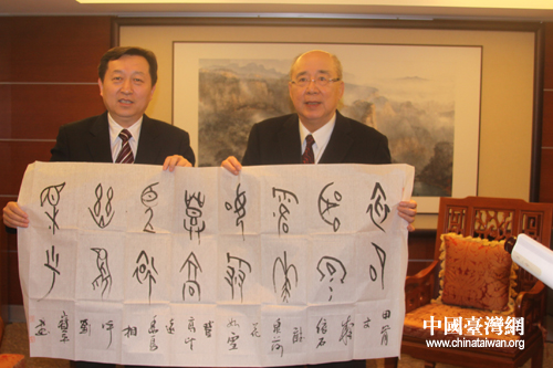 張笑東向中國國民黨榮譽主席吳伯雄贈送甲骨文書法作品。(圖片來源:安陽市臺辦)