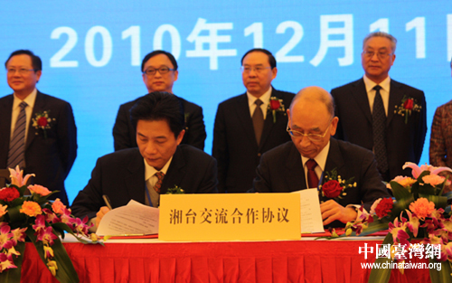 湖南省海峽兩岸交流促進會會長馮波與臺灣中華湖湘文化發展協會理事長張京育在大會上簽署了湘臺交流合作協議。(中國臺灣網 楊永青 攝)
