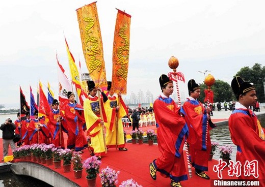 2月14日,以“弘揚臨水文化、促進兩岸交流”為主題的第四屆陳靖姑(福州)文化節(jié)在福州市南江濱公園九龍壁隆重舉行,吸引了來自兩岸各地近千名來賓及信眾同謁臨水夫人陳靖姑。圖為祭祀大典上的儀仗隊。中新社記者 劉可耕 攝