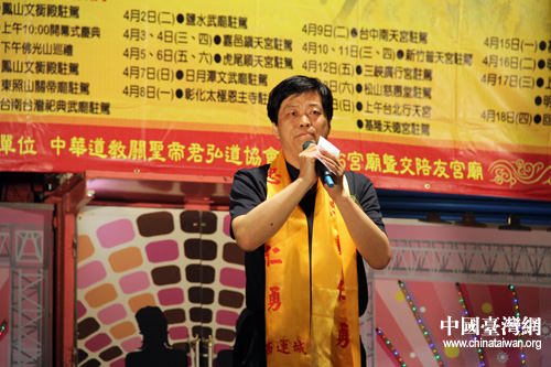 山西關公祖廟圣像巡游團團長、山西運城市委宣傳部常務副部長黃勛會致辭。(中國臺灣網 李典典 攝)