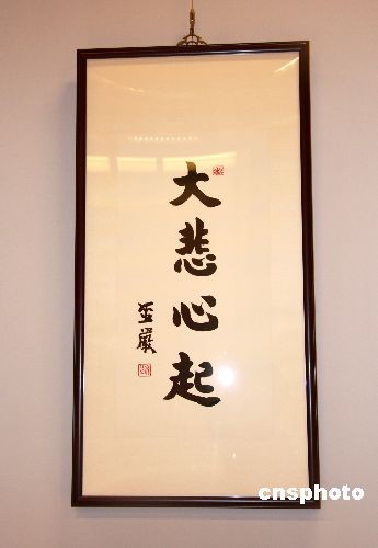 臺灣法鼓山創辦人圣嚴法師三日圓寂,四日移靈金山法鼓山世界佛教教育園區大殿供信眾瞻仰,圖為法鼓山現正展出的圣嚴法師墨寶“大悲心起”。 中新社發 陳立宇 攝