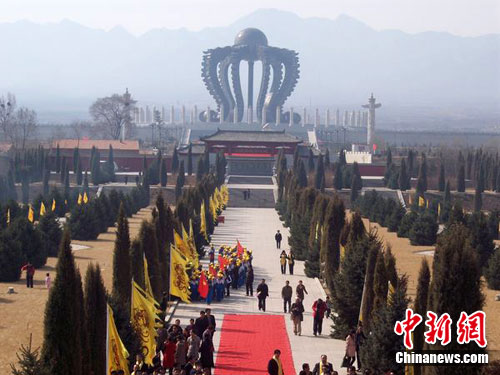 圖為黃帝城全景,遠處為“中華合符壇”,巍巍壯觀,56根民族圖騰柱是中華合符壇工程的主體部分,安裝在中華合符壇中央九龍柱的外圍,代表著五十六個民族都是龍的傳人,象征著中華民族的大團結、大融合。中新網發 譚地 攝