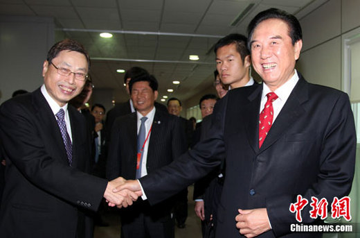 2月28日上午,海協會會長陳云林一行圓滿結束6天的首次經貿之旅,搭乘中華航空公司班機離臺。圖為登機前,陳云林與前往桃園機場送行的海基會副董事長高孔廉握手道別。中新社發 董會峰 攝