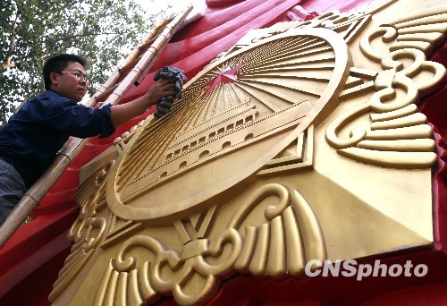 9月24日,兩名工作人員正在對(duì)“寶島臺(tái)灣彩車”仔細(xì)地粉刷。該彩車將參加首都國(guó)慶60周年群眾游行。中新社發(fā) 張宇 攝