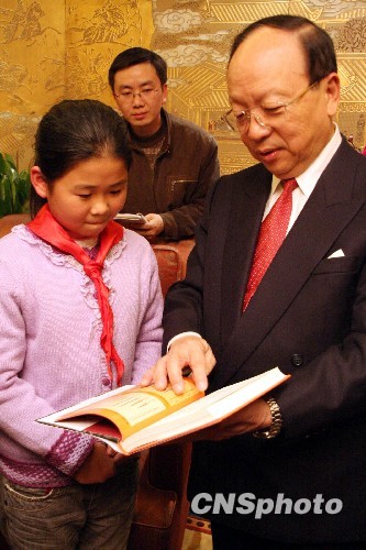 今年夏天,莫拉克臺風重創臺灣南部,大陸各界踴躍捐款捐物,其中最令人感動的,是一封來自西安小學生的親筆信和隨信附上的二十元人民幣小額捐款。中國國民黨副主席蔣孝嚴十九日在西安出席海峽兩岸(陜西)經貿科技合作大會后,特意約見了這位感動了無數臺灣人的十一歲女孩楊卓西。圖為蔣孝嚴向楊卓西贈書。 中新社發 冽瑋 攝