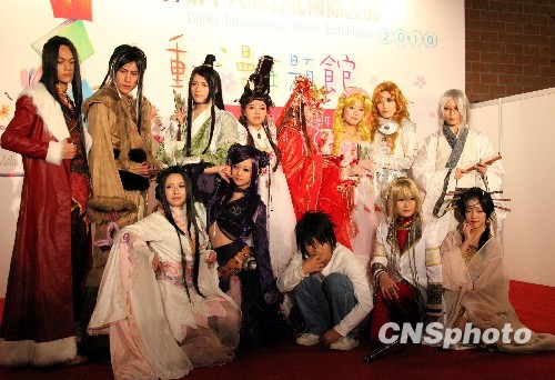 二0一0臺北國際書展一月二十七日在臺北市世貿三個展覽館同時登場,共計八百八十三家出版社、百萬冊以上的書籍參展。圖為在動漫館中兩岸COSPLAY(角色扮演)團體同場競技交流。中新社發 曾嘉 攝