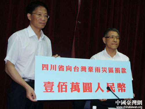 中國臺灣網6月24日臺中消息 6月22日,受中共四川省委書記劉奇葆、省長蔣巨峰委托,正率四川農業交流團在臺灣參訪的中共四川省委常委、副省長鐘勉來到位于臺中市的臺灣省農會,代表中共四川省委、四川省人民政府和9000萬四川人民向臺灣豪雨災區捐款100萬元人民幣,用于近期遭遇豪雨和臺風襲擊,遭受重大損失的農村和農戶賑災,委托臺灣省農會具體實施。