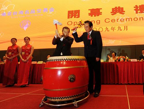 9月17日,海協(xié)會(huì)會(huì)長(zhǎng)陳云林(前右)與臺(tái)北世貿(mào)中心董事長(zhǎng)王志剛(前左)共同擂鼓為交易會(huì)揭幕。當(dāng)日,由南京市政府與臺(tái)北世貿(mào)中心聯(lián)合舉辦的“2009南京臺(tái)灣名品交易會(huì)”在南京國(guó)際博覽中心開(kāi)幕。展會(huì)參展企業(yè)達(dá)到750家,其中臺(tái)灣本土企業(yè)占73%,大陸臺(tái)企占27%,是歷年來(lái)臺(tái)商企業(yè)產(chǎn)品在大陸最大規(guī)模的集中亮相。 新華社記者 姜帆 攝
