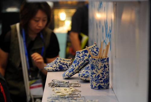 9月17日,一位買家在交易會(huì)上觀看臺(tái)商的“青花瓷”系列創(chuàng)意產(chǎn)品。新華社記者 姜帆 攝