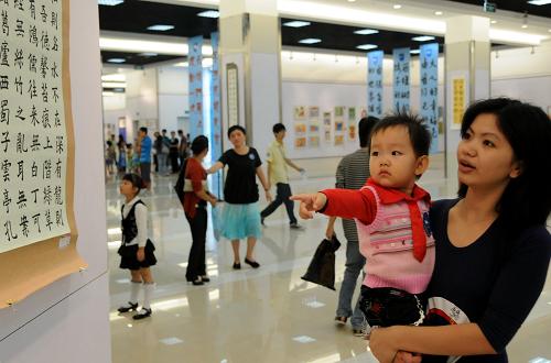 10月24日,在福建閩臺緣博物館,參觀者正在觀看美術作品。當日,首屆海峽兩岸少年兒童美術大展在福建泉州開展。新華社記者 康淼 攝