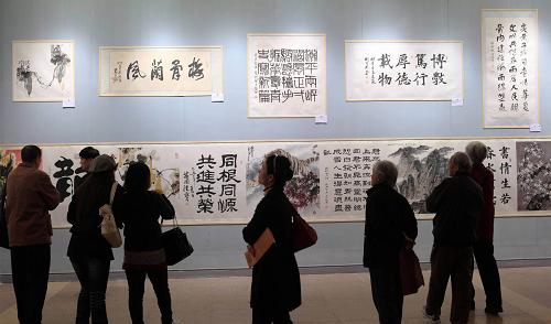 10月28日,觀眾在北京舉行的“海峽兩岸書畫家交流活動(dòng)作品展”上欣賞書法繪畫作品。 新華社發(fā)(羅偉 攝)
