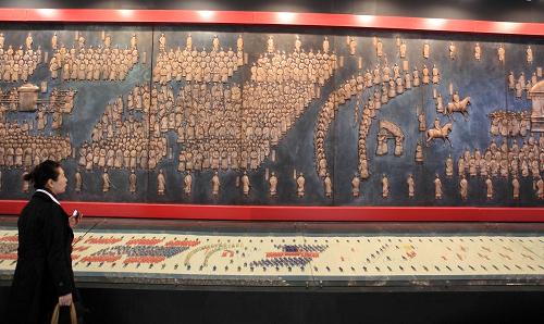 10月28日,觀眾在北京舉行的“海峽兩岸書畫家交流活動(dòng)作品展”上欣賞巨型銅雕作品《大駕鹵簿圖》。 當(dāng)日,“和諧中華·海峽兩岸書畫家交流活動(dòng)作品展”在北京開幕。海峽兩岸近萬(wàn)件書畫作品中遴選出的近500件精品佳作參展。新華社發(fā)(羅偉 攝)